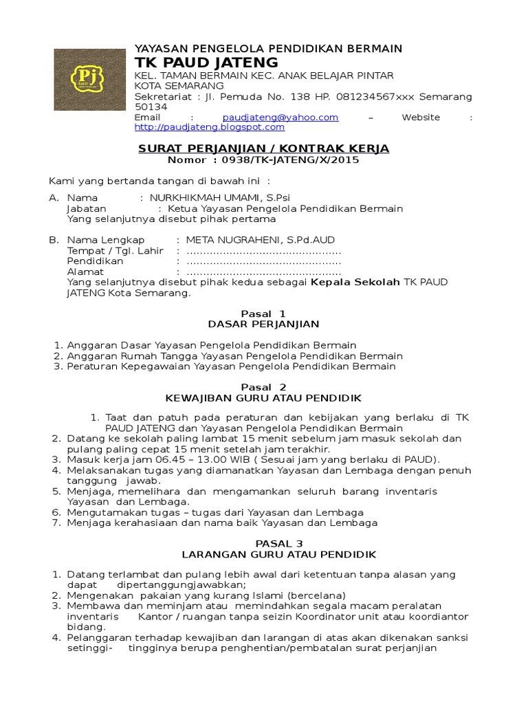 Biasanya yang dimuat atau ditulis dalam surat kontrak kerja guru PAUD adalah job desc atau deskripsi pekerjaan yang akan dilakukan seseorang yang ditetapkan oleh yayasan atau lembaga PAUD. Surat perjanjian kontrak kerja gurukaryawan sekolah adalah surat antara sekolah dan guru dalam ikatan kontrak kerja dengan kesepakatan masing-masing pihak dalam hal larangan dan kewajiban yang harus dipenuhi oleh kedua belah pihak. Atas perhatian BapakIbu pimpinan saya ucapkan terima kasih.