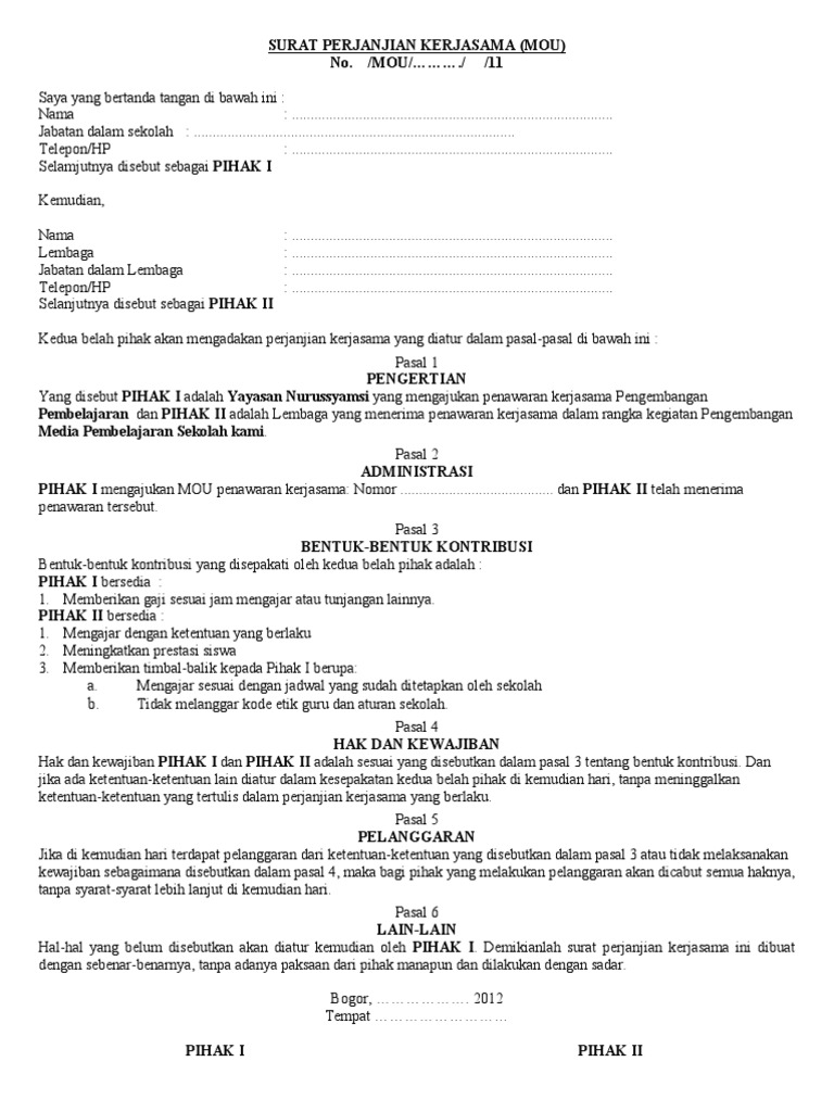 Karena keterbatasan informasi yang Anda berikan kami asumsikan maksud dari kerja sama dengan perusahaaninstitusi lain di sini adalah bertujuan untuk melakukan suatu kegiatan usaha. Surat Kontrak Kerja Guru PAUD adalah surat perjanjian yang menyatakan bahwa seseorang telah bekerja dengan atau tanpa syarat tertentu. Guru di lp3m islamic centre sampa ada panggilan selanjutnya.