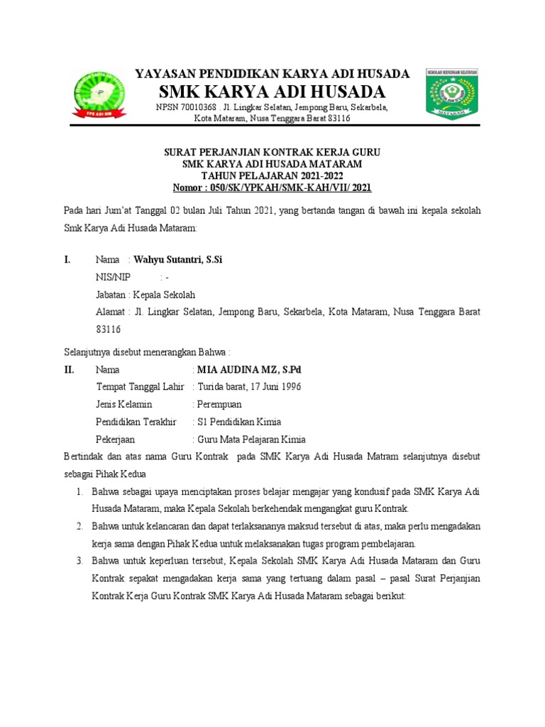 Surat Perjanjian Kontrak Kerja Guru Pdf