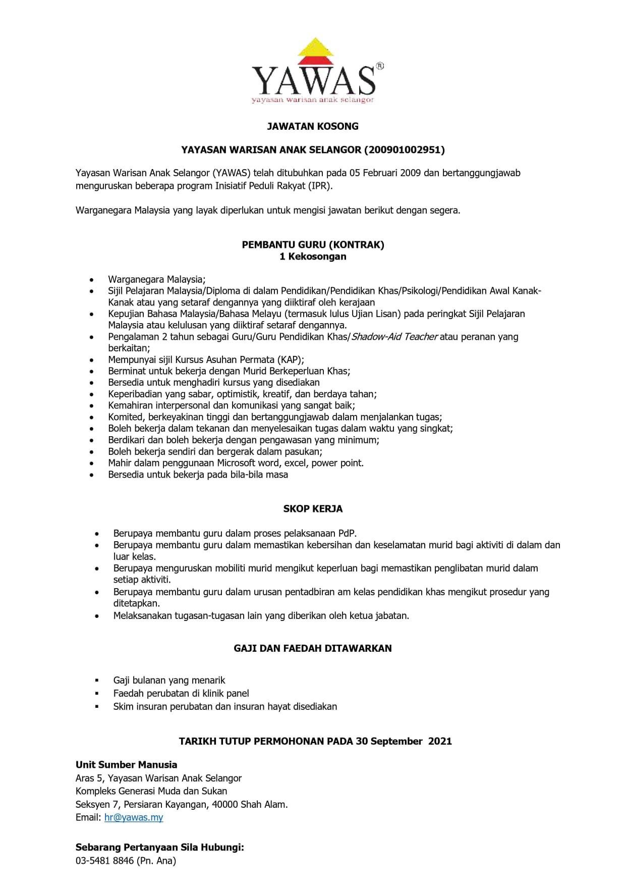 Yawas On Twitter Jawatan Kosong Yayasan Warisan Anak Selangor Guru Pendidikan Khas Pembantu Guru Pendidikan Khas Jurupulih Perubatan Cara Kerja Pertuturan Hantarkan Permohonan Anda Ke Hr Yawas My Tarikh Tutup